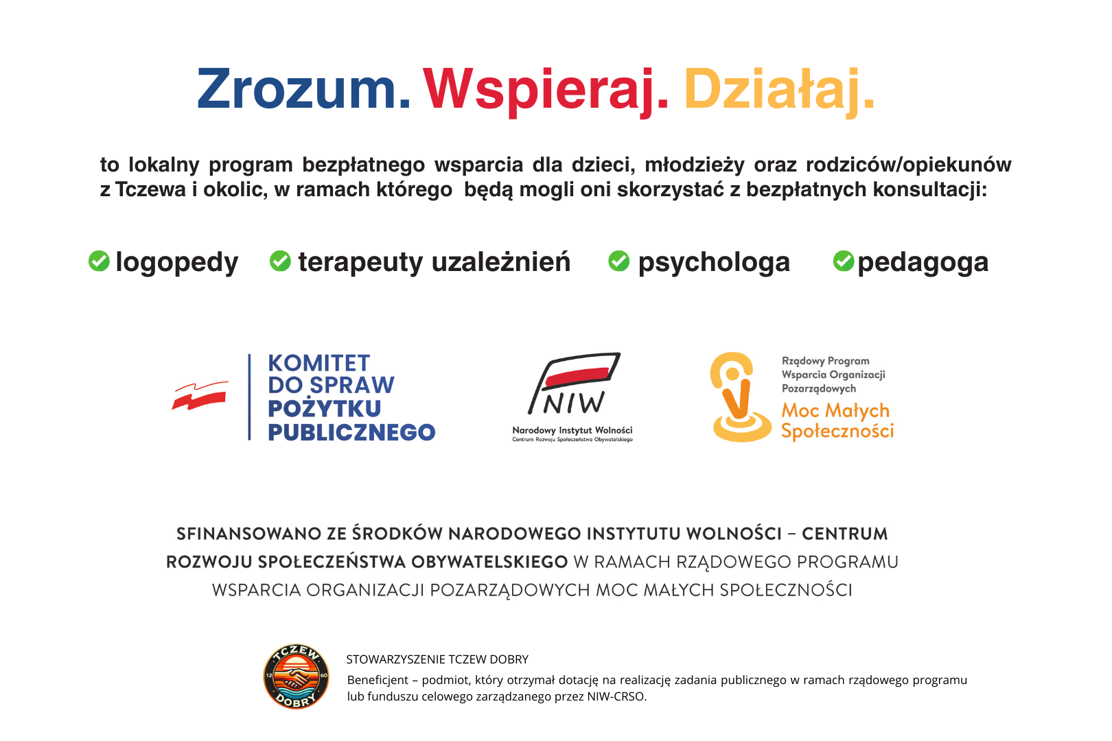 „Tczew Dobry – Zrozum. Wspieraj. Działaj.” to lokalny program bezpłatnego wsparcia dla dzieci, młodzieży i rodziców/opiekunów z Tczewa i okolic. Rdzeniem projektu są: punkt konsultacyjny z dyżurami czterech specjalistów (psycholog, pedagog, logopeda, terapeuta uzależnień) oraz seria krótkich filmów edukacyjnych i kampania informacyjna w mediach społecznościowych. Projekt całościowo realizujemy od 1 września do 30 listopada 2025 r. i finansujemy z dotacji ze środków Narodowego Instytutu Wolności – Centrum Rozwoju Społeczeństwa Obywatelskiego w ramach Rządowego Programu wsparcia organizacji pozarządowych „Moc Małych Społeczności”. Główny element projektu czyli bezpłatne konsultacje będą prowadzone od początku października do końca listopada 2025 roku.